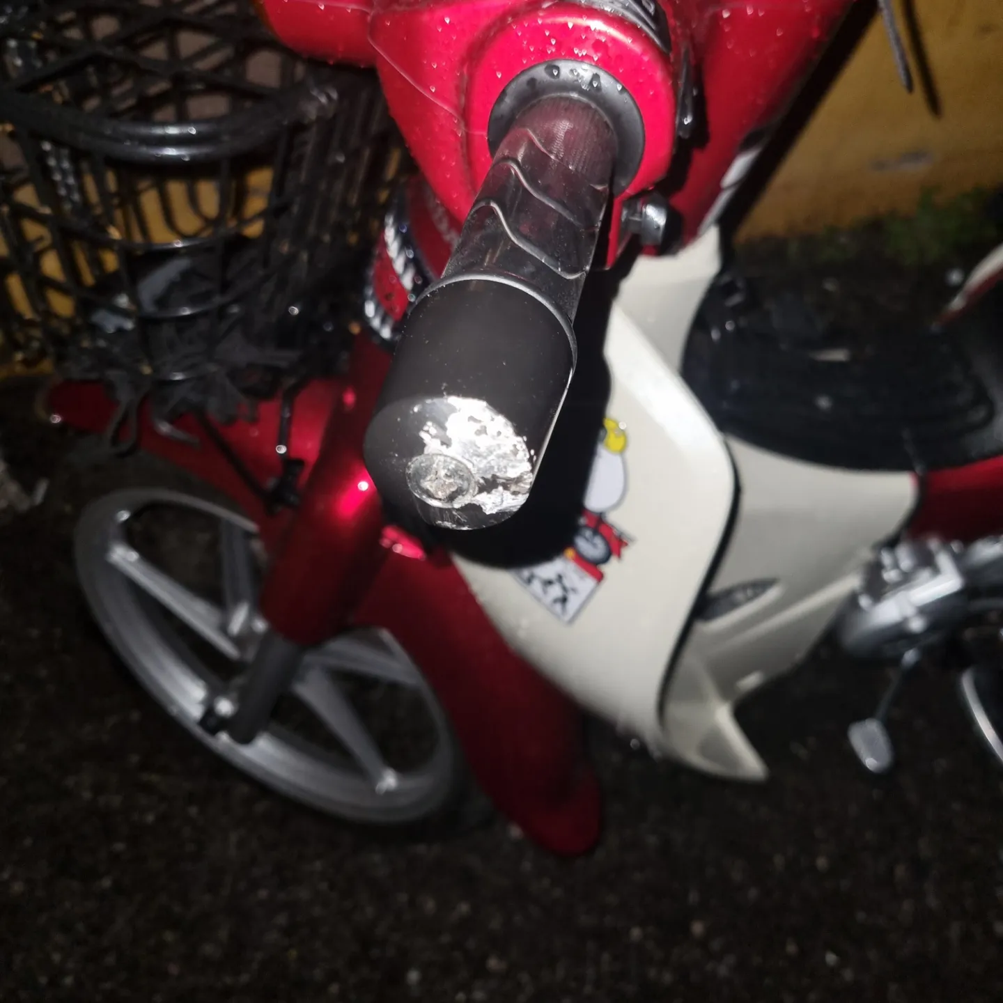 트럭이 후진하면서 너무 깊게 들어왔는지, 주차해 둔 슈퍼커브를 그대로 박아버린 상태였다.