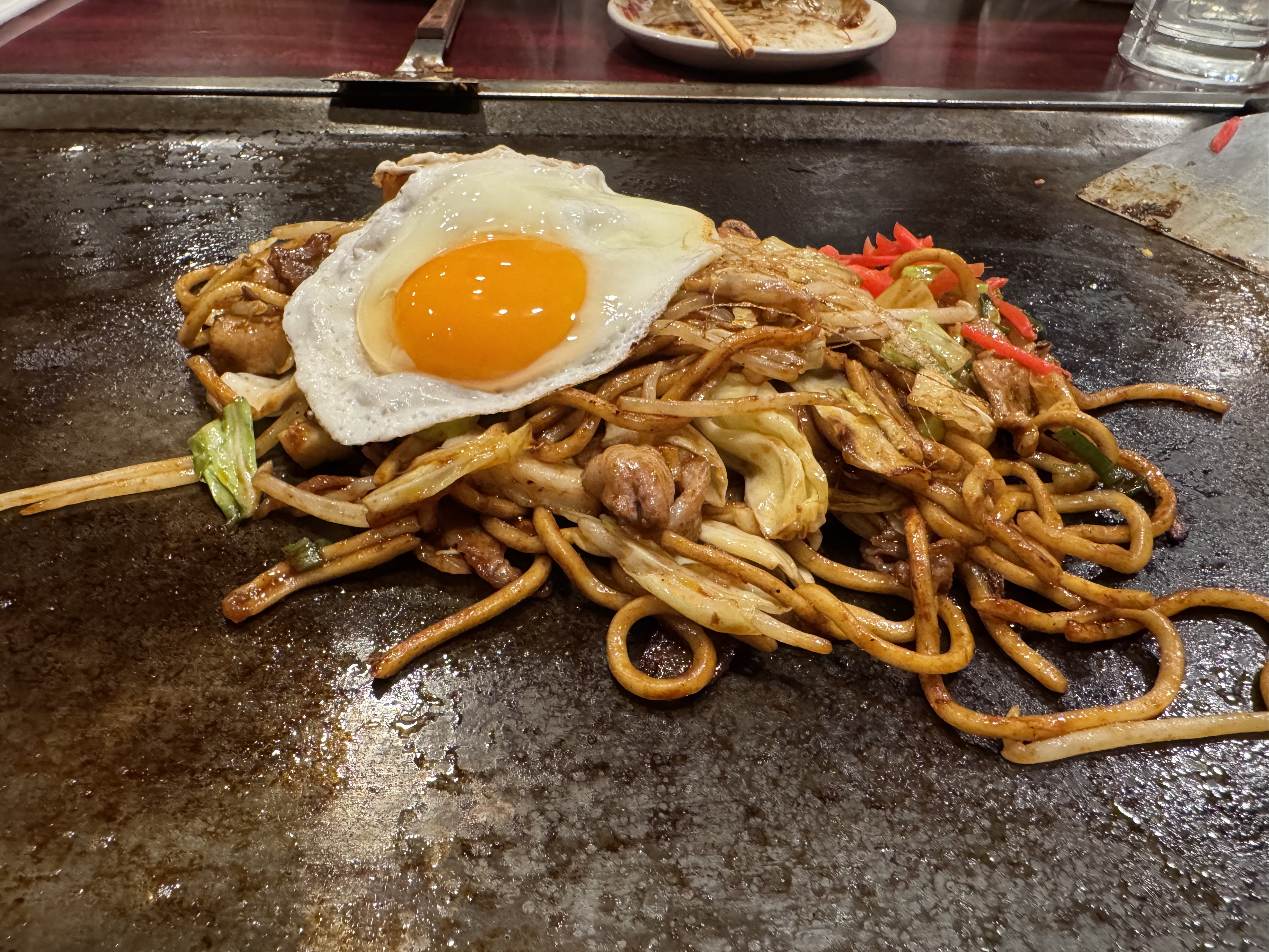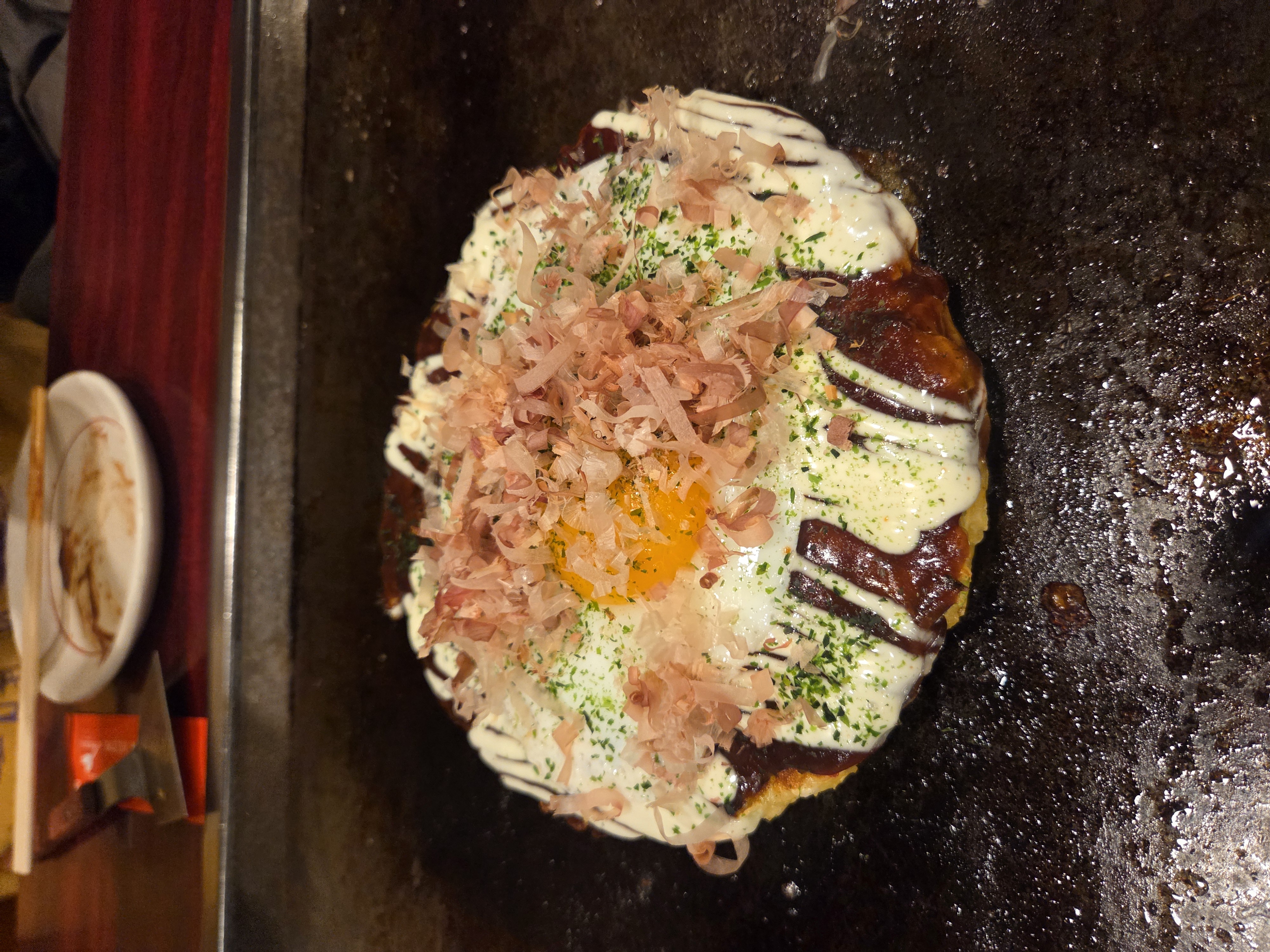 히로시마 오코노미야키는 뭔가 층층이 쌓여 있어서 먹다 보면 조금 잘 부서지는 느낌이 있다면, 오사카 스타일은 전체적으로 훨씬 더 잘 붙어 있고 식감도 단단한 편이다.